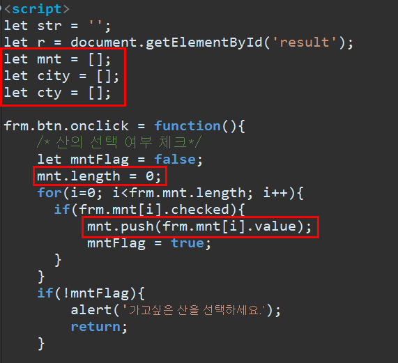 예제 : 가고싶은 산, 살고싶은 지역, 가봤던 나라 복수선택하여 선택값 출력하기